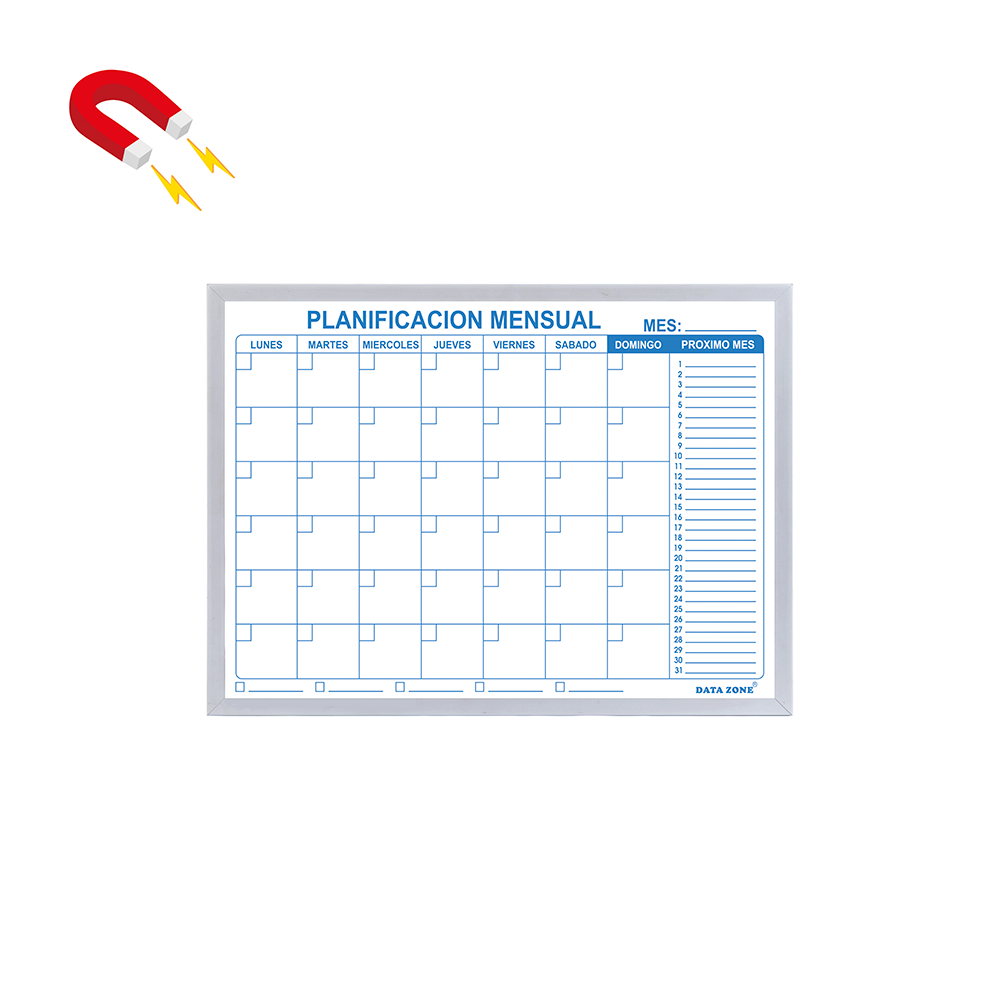 Pizarra magnética de muro con planificador mensual. Medidas: 60 x 45 cm.